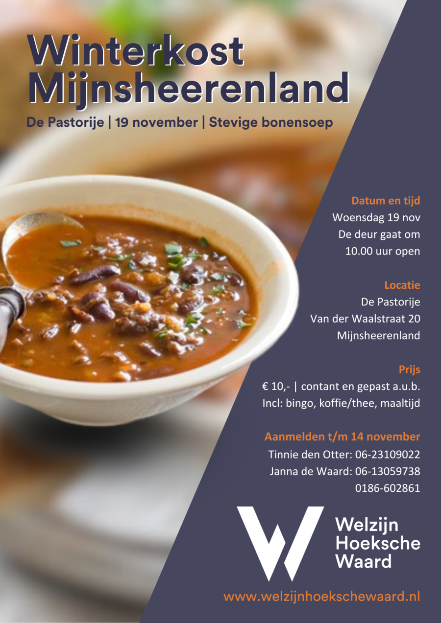MIJNSHEERENLAND - Op woensdag 19 november is het weer tijd voor Winterkost in de Pastorije aan de Van der Waalstraat 20 in Mijnsheerenland. Deze gezellige activiteit wordt georganiseerd door een enthousiaste groep vrijwilligers van Welzijn Hoeksche Waard en is speciaal bedoeld voor 55-plussers uit de omgeving. Vanaf 10.00 uur staat de koffie of thee met iets lekkers voor u klaar, waarna er een gezellig bingo-spel op het programma staat. Rond het middaguur wordt er genoten van een heerlijke warme lunch – echte winterkost om samen van te smullen! De bijeenkomst duurt tot ongeveer 13.30 uur.