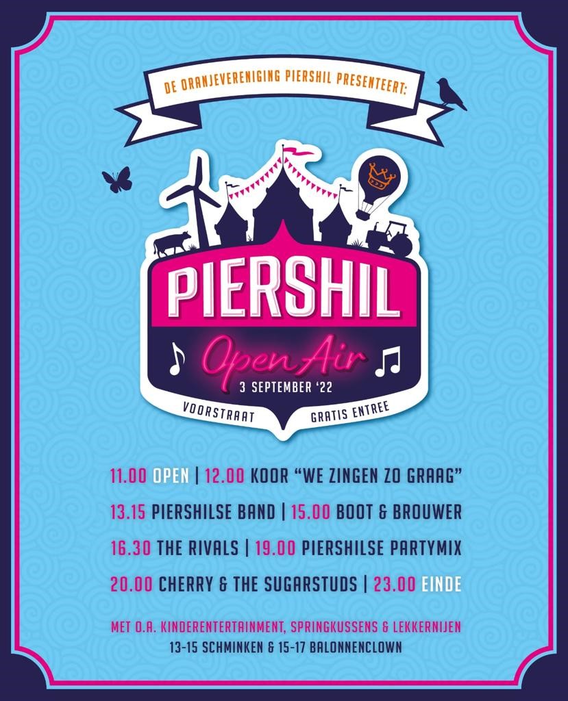 Update: In verband met het vreselijke ongeluk op buurtschap Zuidzijde heeft de organisatie besloten het evenement te annuleren.PIERSHIL - Oranjevereniging Piershil Organiseert op 3 september 2022 de 2e editie van Piershil Open Air. Dit evenement wordt op de Voorstraat in Piershil gehouden. Toegang is gratis en iedereen is welkom.