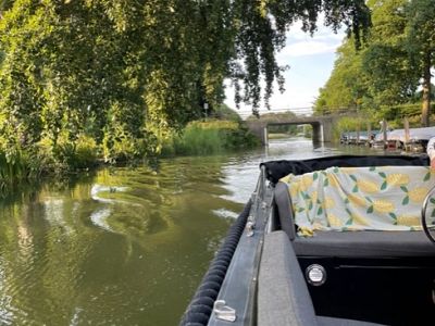 Als we terugvaren, zakt de zon langzaam in de Binnenmaas. Kleindochter bibbert van de kou. Het kleine grut in de boezemvliet schuilt veilig onder moeders vleugels.